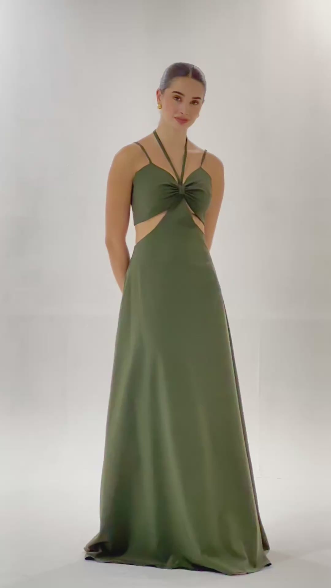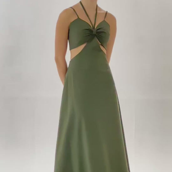 Vestido largo de silueta fluida con diseño cut-out frontal que equilibra sensualidad y sofisticación. Fruncido central cuenta con tiras ajustables que pueden amarrarse al cuello o anudarse al frente, permitiendo personalizar el ajuste y el estilo según tu preferencia. Los laterales descubiertos estilizan el torso, mientras la falda larga cae suavemente, acompañando el movimiento con elegancia natural.